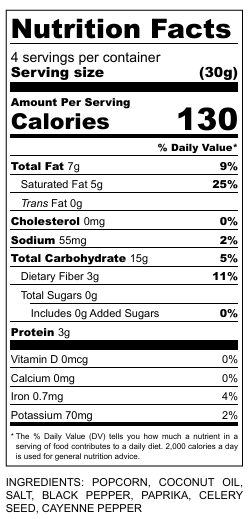 Premium Non-GMO Popcorn, Coconut oil, Salt, Celery Seed, Red Pepper, Black Pepper, Paprika